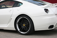 Three-piece NOVITEC ROSSO NF3 wheels are important components in the spectacular appearance of the customized 599 GTB. They are available in a number of different color combinations. The double-spoke wheels exceed the size of the production wheels by one inch on front and rear axle, and are fitted with Pirelli high-performance tires. The front axle features size 9Jx20 wheels with size 275/30 ZR 20 tires. On the rear axle size 12.5Jx21 wheels with tires in size 355/25 ZR 21 make full use of the available space under the wheel arches.